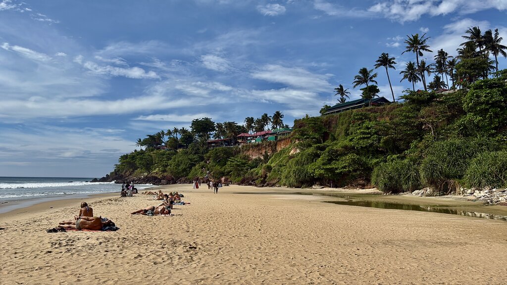 Позавтракав мы отправились на пляж. Пляж Варкала интересен тем, что на самом пляже нет баров и ресторанов, а они находятся наверху, на утесе, который простирается вдоль пляжа.