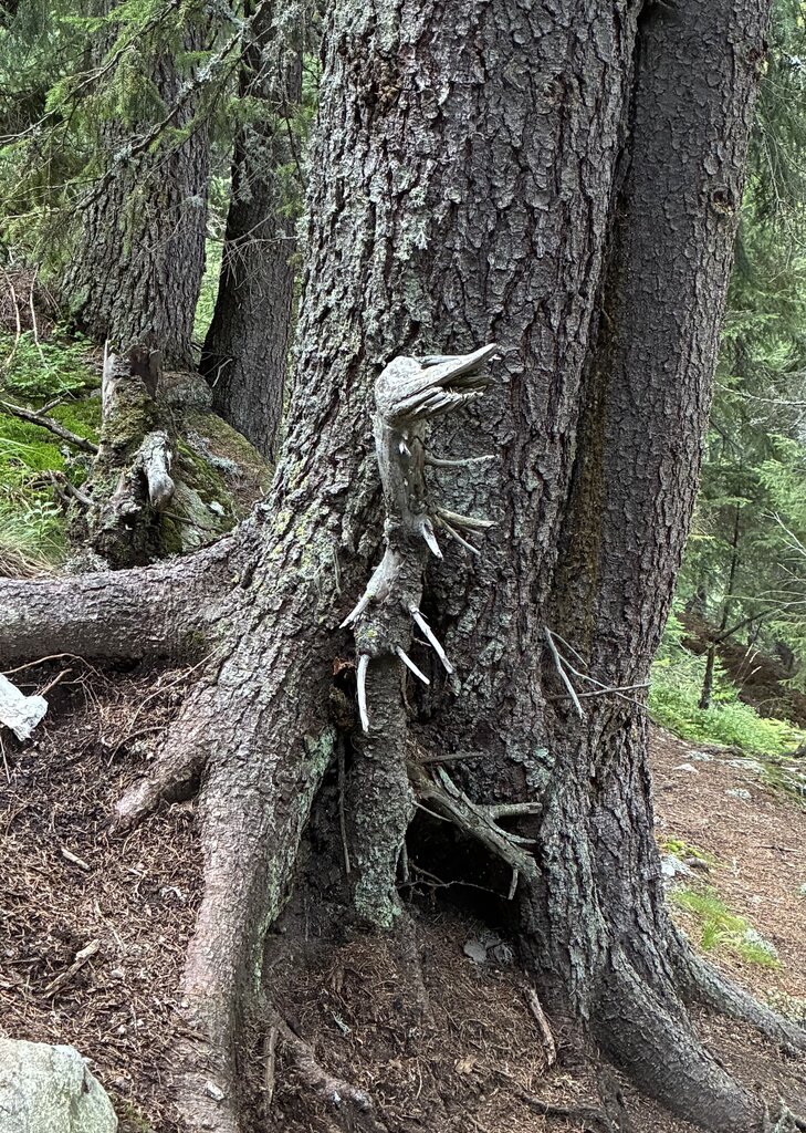 Последний участок пути оказался очень крутым спуском, по моим расчетом последние часа полтора мы спускались по камням в лесу с уклоном под 45 градусов. Казалось, что лес заколдованный и никогда не закончится. Встречались довольно забавные силуэты.